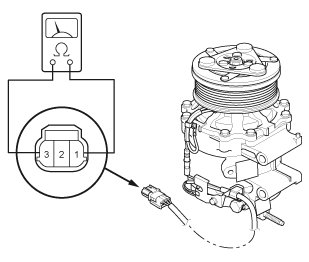 5. USA and Canada models: Check for continuity between the A/C compressor clutch connector terminals No. 1 and No. 3. If there is no continuity, replace the thermal protector.