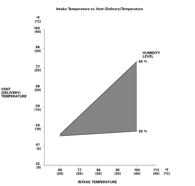 NOTE: The vent (delivery) temperature and intake temperature should intersect in the shaded area. Any measurements outside the line may indicate the need for further inspection.