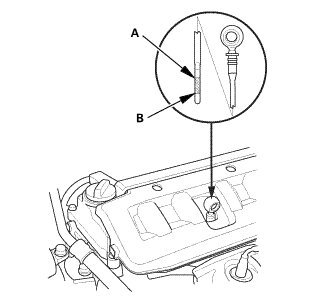 3. Check the engine oil level. It should be between the upper mark (A) and the lower mark (B).