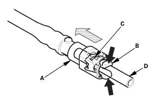 4. Disconnect the quick-connect fitting: Hold the connector (A) with one hand, and squeeze the retainer tabs (B) with the other hand to release them from the locking tabs (C). Pull the connector off.