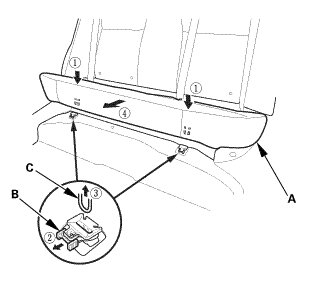 2. While pushing down the rear seat cushion (A), pull the seat hook handles (B) to release the hooks (C).