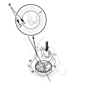 2. Align the marks (A) on the fuel tank and the fuel tank unit, then insert the fuel tank unit into the fuel tank.