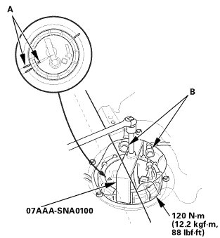 1. Insert the fuel tank unit (A) into the fuel tank with a new O-ring (B).