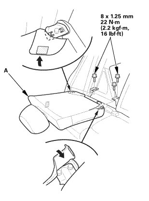 1. Remove the bolt (A) securing the rear seat cushion (B).