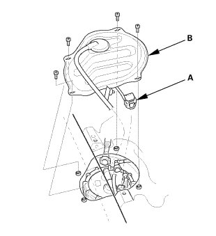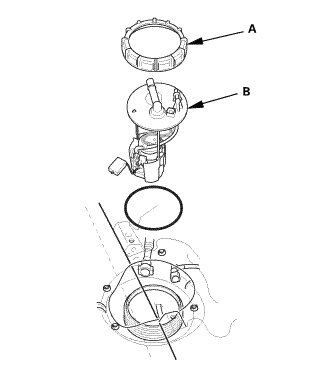 1. Insert the fuel tank unit (A) into the fuel tank with a new O-ring (B).