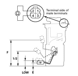 1. Measure the resistance between fuel tank unit 4P connector terminals No. 1 and No. 3 with the float at E (EMPTY), LOW (LOW FUEL INDICATOR), 1/2 (HALF FULL), and F (FULL) positions.