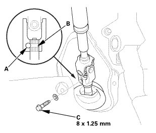 * Pinion shaft with center guide: Install the steering joint by aligning the center guide (C).