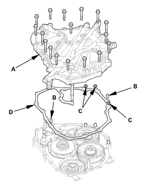 1. Remove the shift solenoid valve cover (A) with the dowel pins (B), the gasket (C), and the clamp bracket (D).
