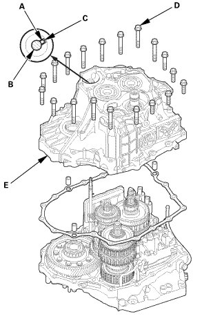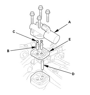 1. Remove A/T clutch pressure control solenoid valve A with the ATF joint pipes (B), the O-rings (C), the 35 mm ATF pipe (D), and the gasket (E).