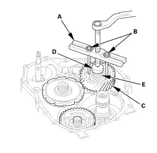 21. Set a spacer (D) between the puller and the secondary shaft (E).