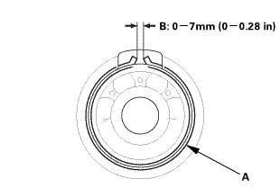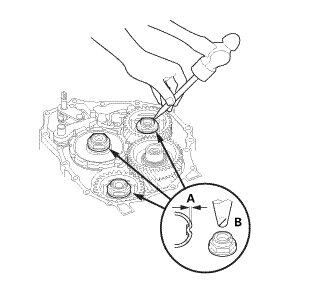 4. After installing the bearing check that the snap ring (A) is seated in the bearing and the transmission housing groove, and that the snap ring end gap (B) is correct.