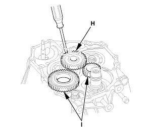 4. Wrap the tip of a screwdriver with tape so the reverse idler gear teeth do not get damaged. Engage the reverse idler gear (H) with the reverse gears (I) by rotating the idler gear using the screwdriver.