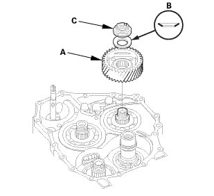 3. Install the mainshaft idler gear (A), the old conical spring washer (B), and the old locknut (C), and tighten the locknut to 216 Nm (22.0 kgfm, 159 lbfft).