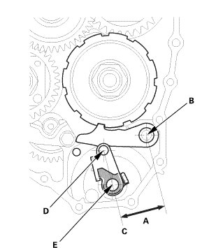 28. Measure the distance (A) between the park pawl shaft center (B) and the extension line (C) connected centers of the park lever roller pin (D) and the control shaft (E) in the vertical direction from the extension line.