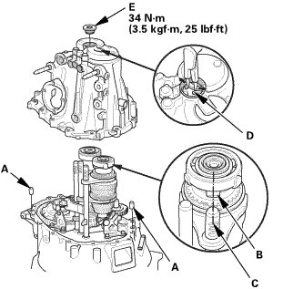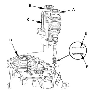 4. Install the mainshaft assembly (D) and the countershaft assembly (E) with the shift fork assembly (F), as an assembly.