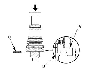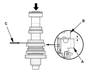 1. Measure the clearance between 1st gear (A) and the 1st gear distance collar (B) with a feeler gauge (C).