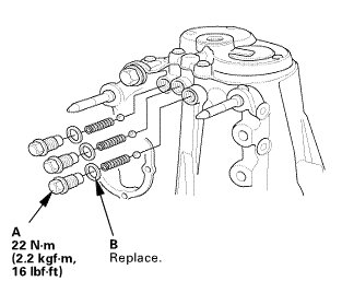 12. Install the steel balls, the detent ball springs, and the detent bolts (A) with new 12 mm sealing washers (B).