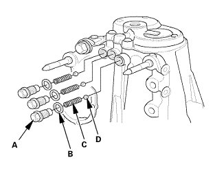 1. Remove the detent bolts (A), the 12 mm sealing washers (B), the detent ball springs (C), and the steel balls (D).