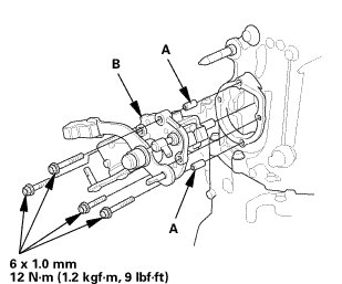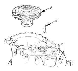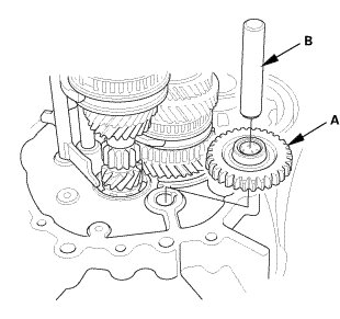 1. Remove the reverse idler gear (A) and the reverse idler gear shaft (B).