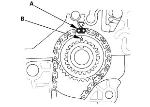 2. Install the oil pump chain on the crankshaft sprocket with the colored link plate (A) aligned with the TDC mark (B) on the crankshaft sprocket.