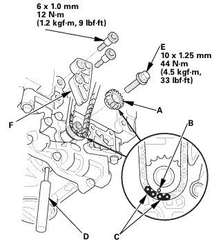 5. Apply new engine oil to the threads of the oil pump sprocket mounting bolt (E), then install the oil pump sprocket mounting bolt and the oil pump chain guide (F).