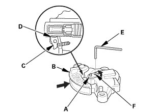 1. Compress the auto-tensioner when replacing the cam chain. Remove the pin (A) from the auto-tensioner that was installed during removal. Turn the plate (B) counterclockwise, to release the lock, then press the rod (C), and set the first cam (D) to the first edge of the rack (E). Insert the 1.2 mm (3/64 in) diameter pin back into the holes (F).
