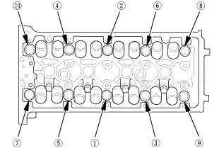 8. Torque the cylinder head bolts in sequence to 39 Nm (4.0 kgfm, 29 lbfft). Use a beam-type torque wrench. When using a preset click-type torque wrench, be sure to tighten slowly and do not overtighten. If a bolt makes any noise while you are torquing it, loosen the bolt and retighten it from the first step.