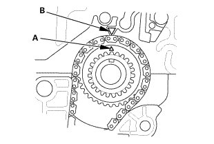 3. Install the cam chain on the crankshaft sprocket with the colored link plate (A) aligned with the mark (B) on the crankshaft sprocket.
