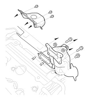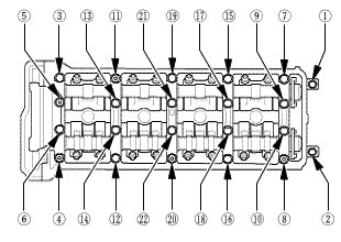 2. Remove the camshaft holder bolts. To prevent damaging the camshafts, loosen the bolts, in sequence, two turns at a time.