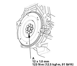 3. Tighten the flywheel mounting bolts (A) in a crisscross pattern in several steps.