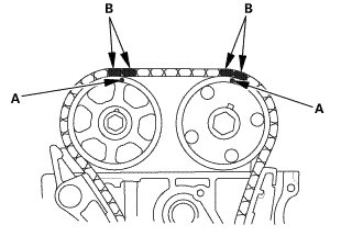 4. Install the cam chain on the VTC actuator and the exhaust camshaft sprocket with the punch marks (A) aligned with the center of the two colored link plates (B).