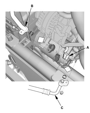 1. Connect an R-134a refrigerant recovery/recycling/charging station (A) to the high-pressure service port (B) and the low-pressure service port (C), as shown, following the equipment manufacturer's instructions.