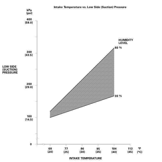 NOTE: The low side (suction) pressure and intake temperature should intersect in the shaded area. Any measurements outside the line may indicate the need for further inspection.