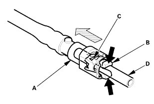 5. Disconnect the quick-connect fitting: Hold the connector (A) with one hand, and squeeze the retainer tabs (B) with the other hand to release them from the locking tabs (C). Pull the connector off.