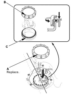 * When installing the fuel gauge sending unit (B), make sure the connection is secure and the connector is firmly locked into place. Be careful not to bend or twist it excessively.