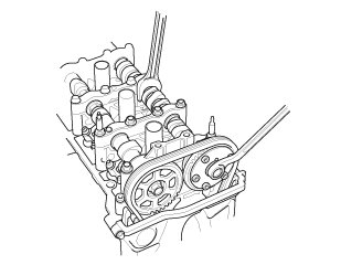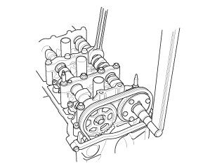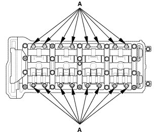 2. Remove the camshaft holder bolts. To prevent damaging the camshafts, loosen the bolts, in sequence, two turns at a time.
