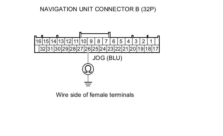10. Check for continuity between and navigation unit connector B (32P) terminal No. 26 and body ground.