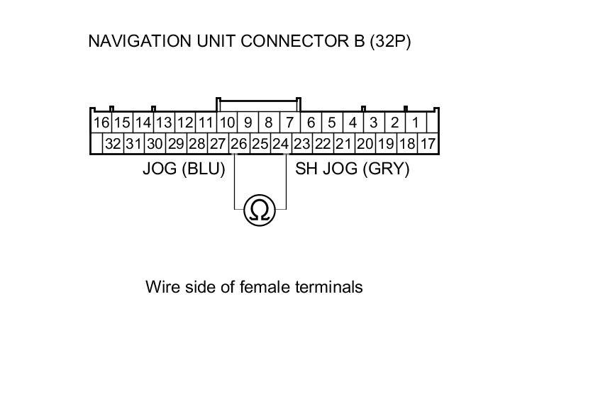 11. Check for continuity between navigation unit connector B (32P) terminals No. 24 and No. 26.