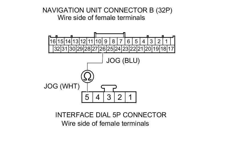 12. Check for continuity between navigation unit connector B (32P) terminal No. 26 and interface dial 5P connector terminal No. 5.