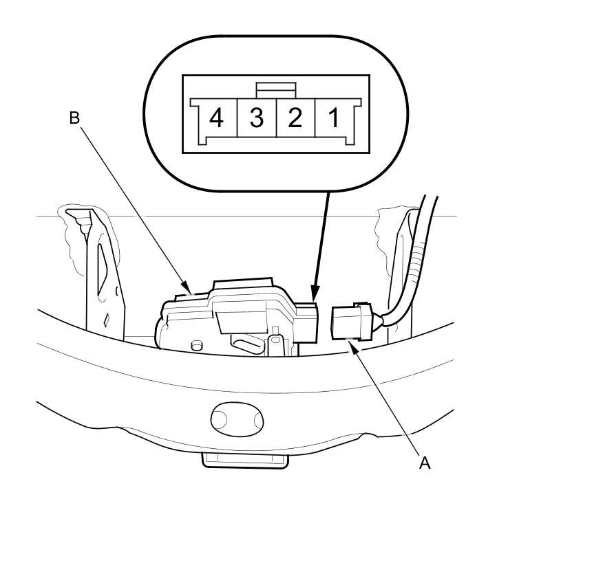 2. Disconnect the 4P connector (A) from the tailgate latch assembly (B).