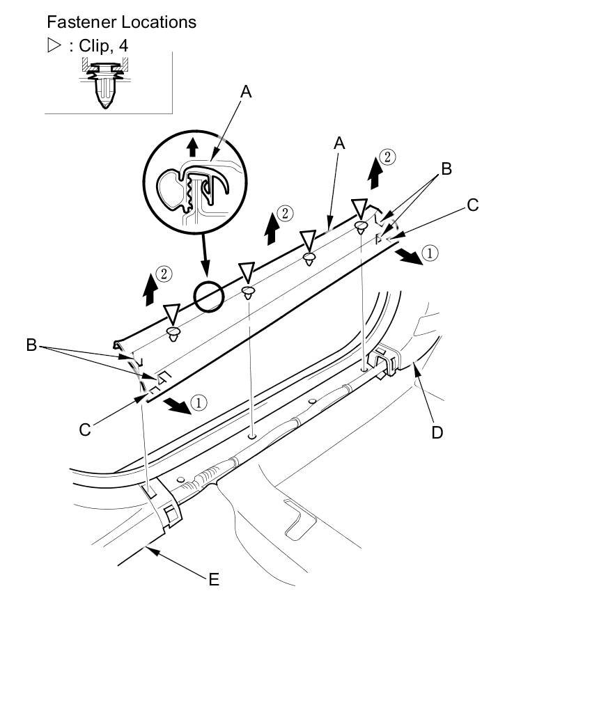 2. Pull up the trim by hand to detach the clips (E, F).