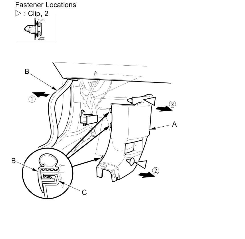 1. Pull out the front door opening seal (B) as needed from the kick panel hooks (C).