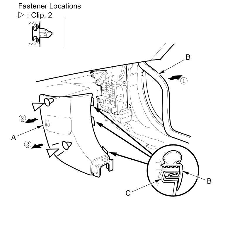 2. Pull back the kick panel by hand to detach the clips.