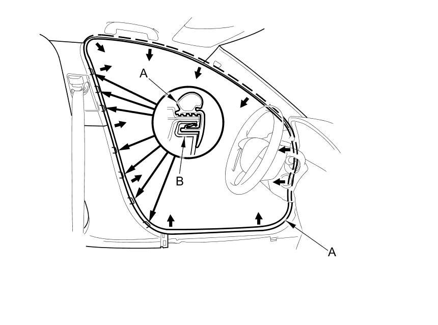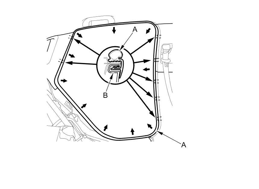 3. Pull out the front door opening seal (A) from the trim hooks (B) around the front door opening flange, then remove the seal.