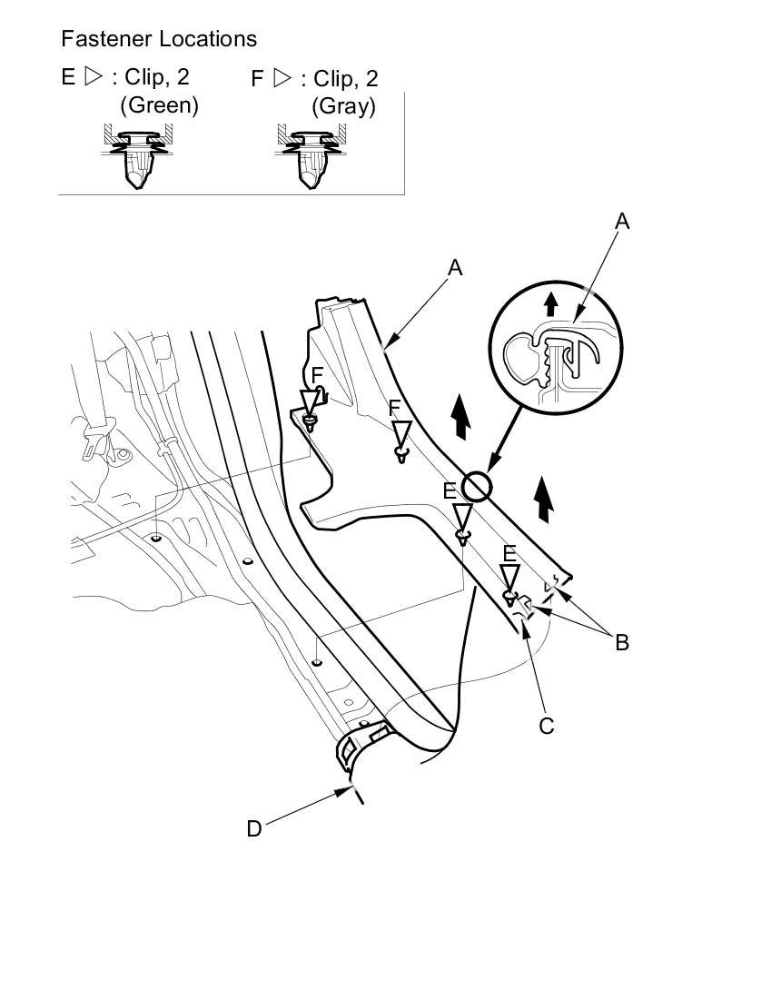 1. Release the hooks (B) and the tabs (C) from the kick panel (D) and the B-pillar lower trim (E).