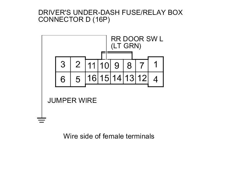 12. Connect driver's under-dash fuse/relay box connector D (16P) terminal No. 10 and body ground with a jumper wire.