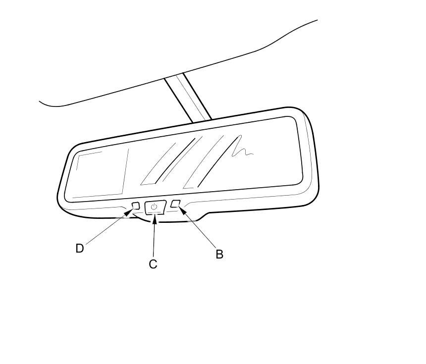 The rearview mirror with rearview camera display system consists of a rearview camera and an automatic dimming inside mirror with a built-in rearview camera display. When the transmission range switch is in R position, the rearview monitor is on, and the image from the rearview camera appears. Brightness of the rearview camera display changes automatically using the front-facing lux level sensor (A), rear-facing lux level sensor (B), and the control unit for the automatic dimming inside mirror. The rearview monitor mirror's brightness will gradually dim if it is operated for a long time. The rearview monitor turns off, when the automatic dimming off button (C) is pressed and the indicator (D) goes off, or the transmission range switch is in other than R position.