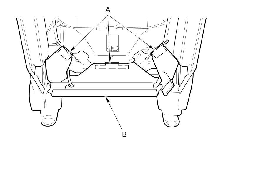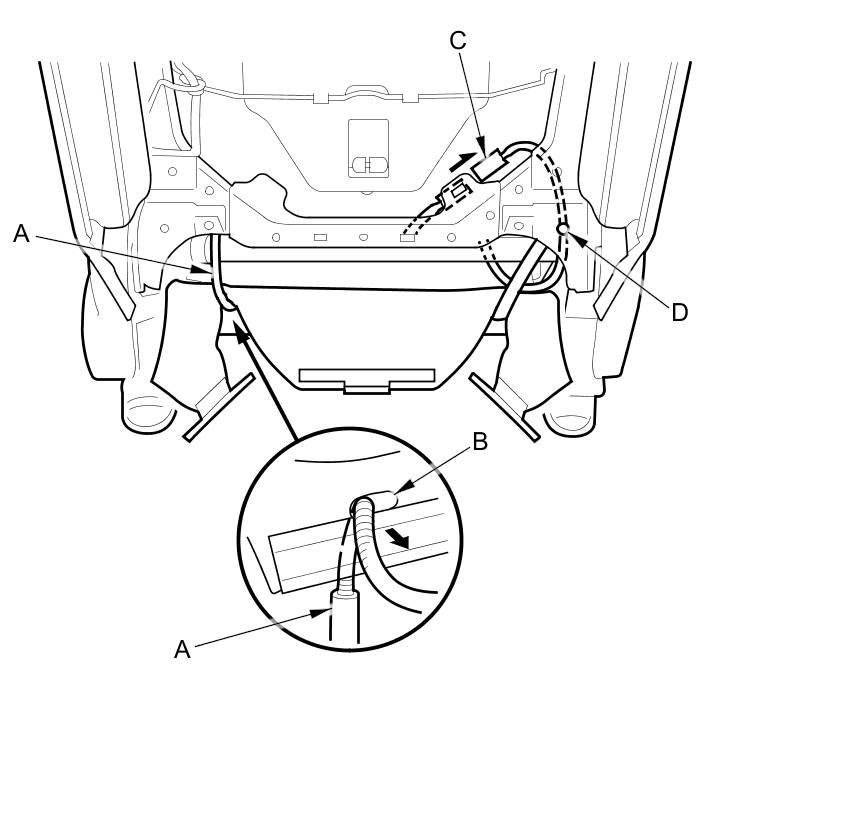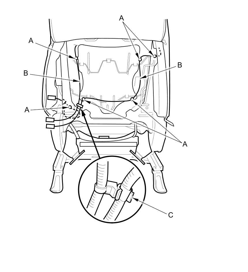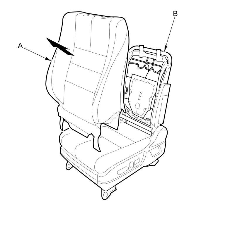 - Reinstall airbag attachment wires A, B securely to the seat-back frame as shown.