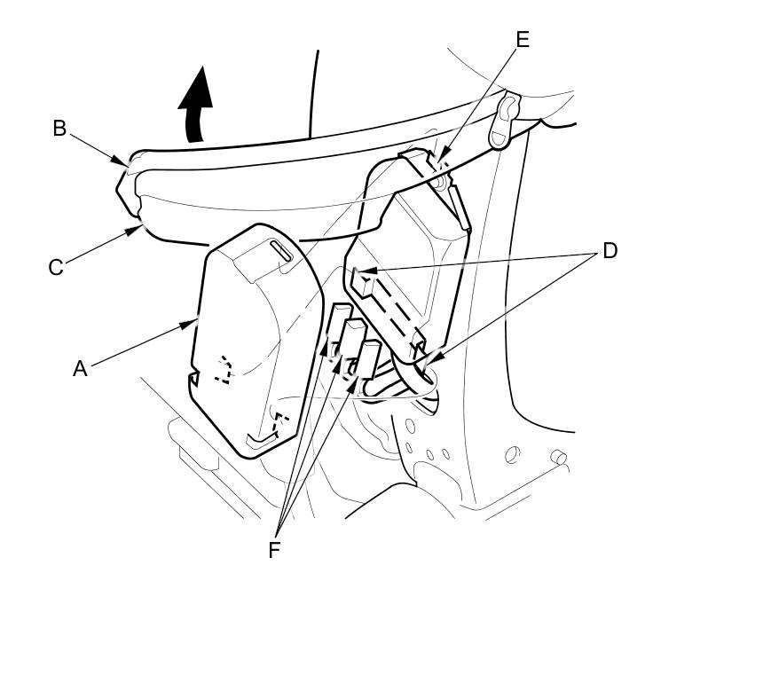 3. From under the seat cushion (A), disconnect the side airbag connector (B) and detach the harness clip (C). Pry up the hooks (D) of the harness holder (E), then release the holder from the seat cushion frame spring (F).