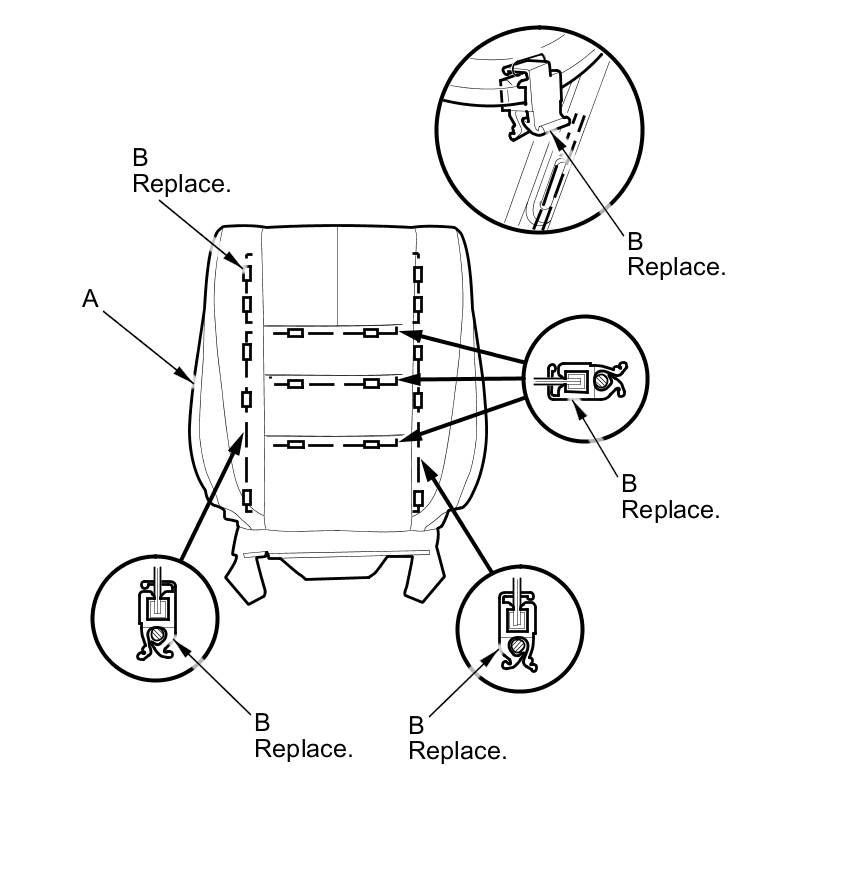 14. Pull back the edge of the seat-back cover (A) all the way around, and release the clips (B), then remove the cover.